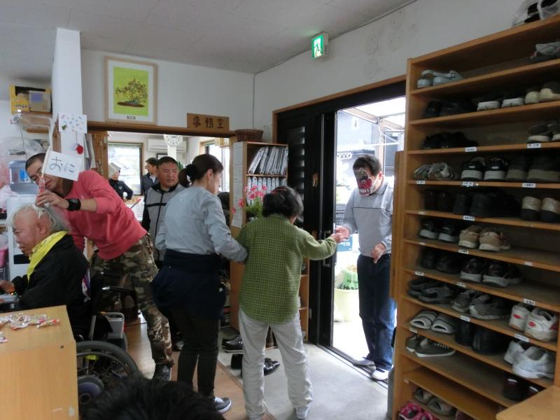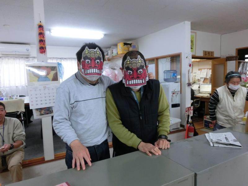 立候補してくれたSさん2人と年男のK君に鬼役をお願いし豆まきをしました。